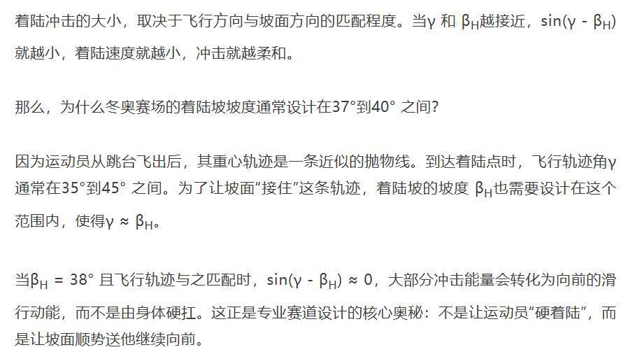 但冬奥赛场的设计师们早就算好了这笔账。他们根据运动员的飞行轨迹,将着陆坡坡度精确设计在37°到40°之间——这恰好与运动员抛物线轨迹的落点角度完美吻合[1]。这就是为什么“89度叫坡”——只要差一度,从“致命”变成“可行”。